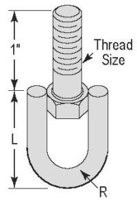 Part No. Thread Size L (mm) R Max. Rec. Load lbs Max. Rec. Load kN Wt. Each lbs Wt. Each kg M2350 3/8 - 16 1 3/4" (44.4) 1/4" (6/3) 620 2.76 0.15 0.07 M2350 1/2" - 13 2" (50.8) 3/8" (9.4) 1150 5.12 0.20 0.09 Unless otherwise specified, all dimensions on drawings and in